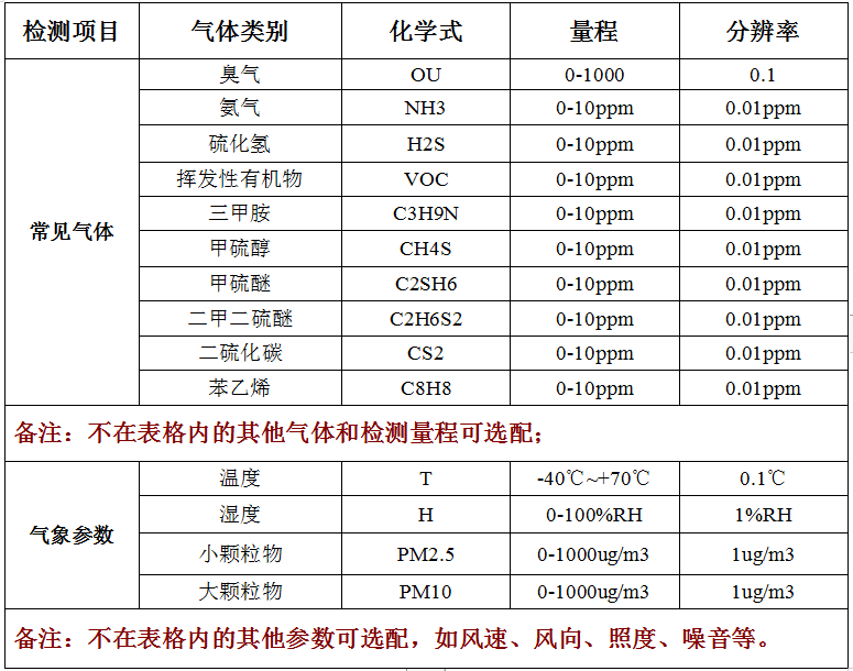 任選氨氣、三甲胺、硫化氫、甲硫醇、甲硫醚、二甲二硫、二硫化碳、苯乙烯、臭氣OU值在內的1-9個指標,目標氣體可進行任意組合、檢測原理不限、檢測濃度范圍不限,同時支持選配其他氣體和PM2.5、PM10、溫濕度、風速風向、大氣壓、噪音、照度等氣象參數監測。